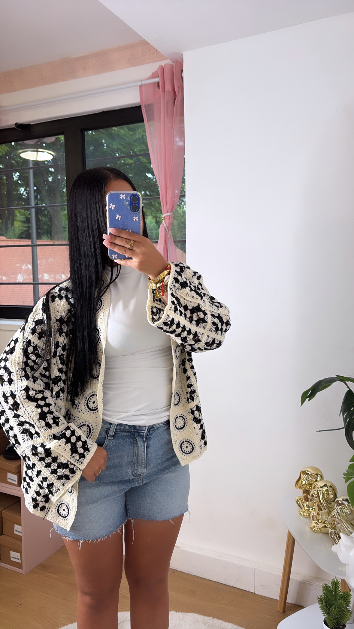 Un incontournable revisité : ce cardigan crochet noir & crème apporte une touche bohème et rétro à vos looks. Son jeu de contrastes entre le noir profond et le crème lumineux en fait une pièce facile à assortir, que ce soit avec un jean, un short ou une robe.