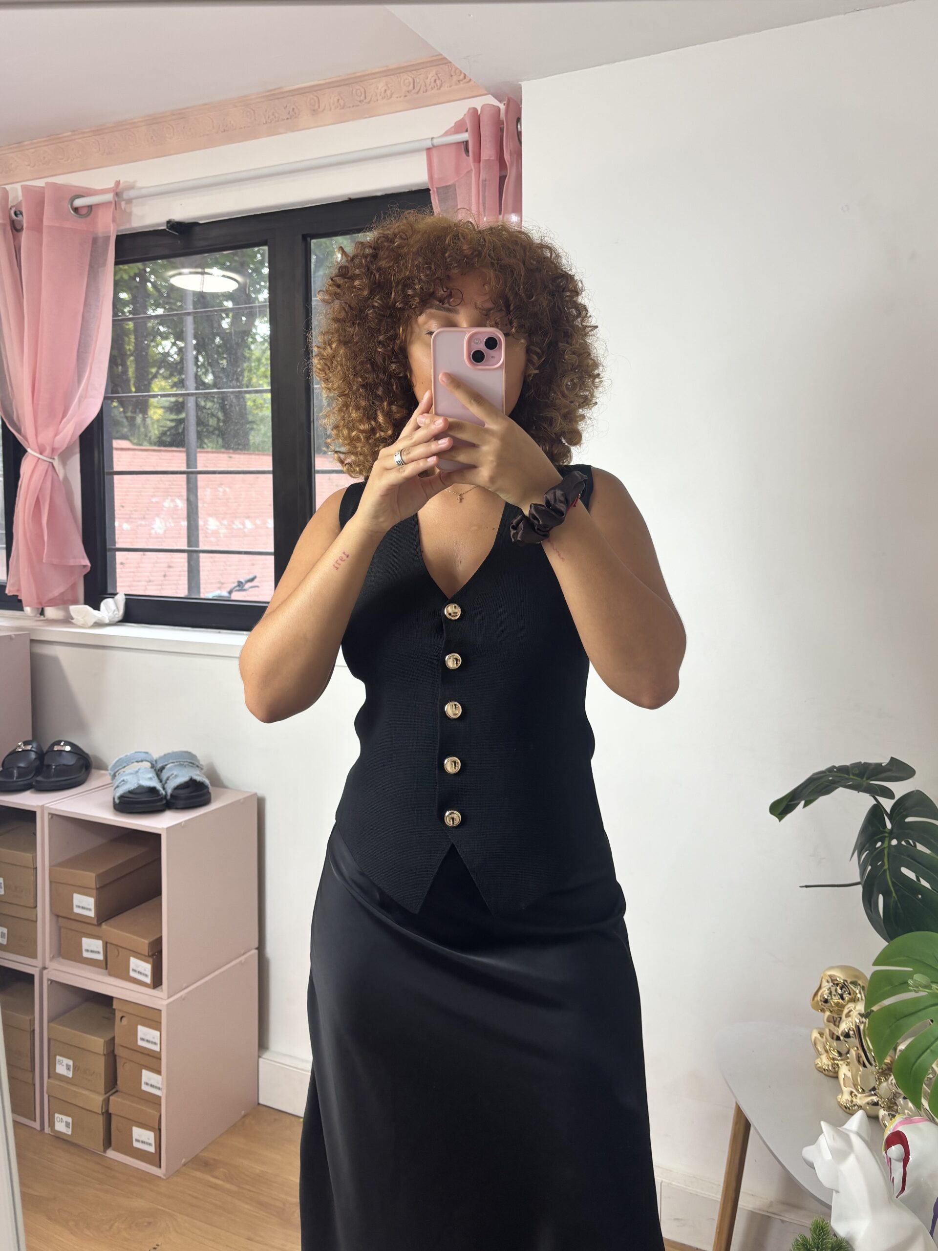 Élégant et intemporel, ce gilet sans manches noir est la pièce parfaite pour sublimer vos tenues. Avec son décolleté en V et ses boutons dorés, il combine simplicité et raffinement.