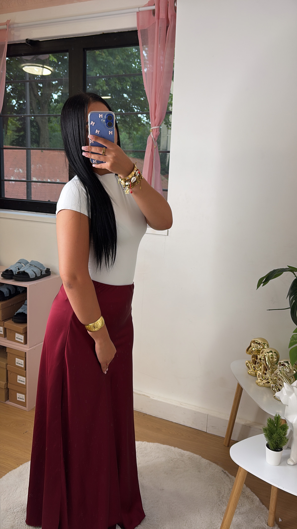Apportez une touche de sophistication à votre garde-robe avec notre jupe longue en satin bordeaux. Sa coupe fluide et sa matière satinée offrent un tombé élégant qui sublime la silhouette.